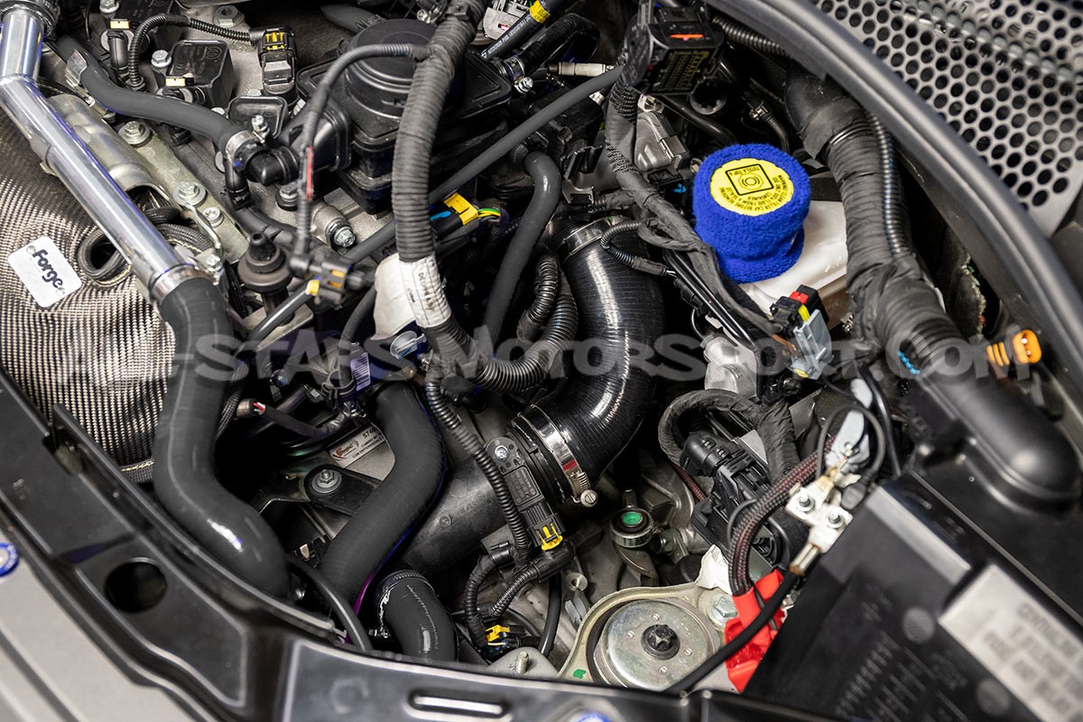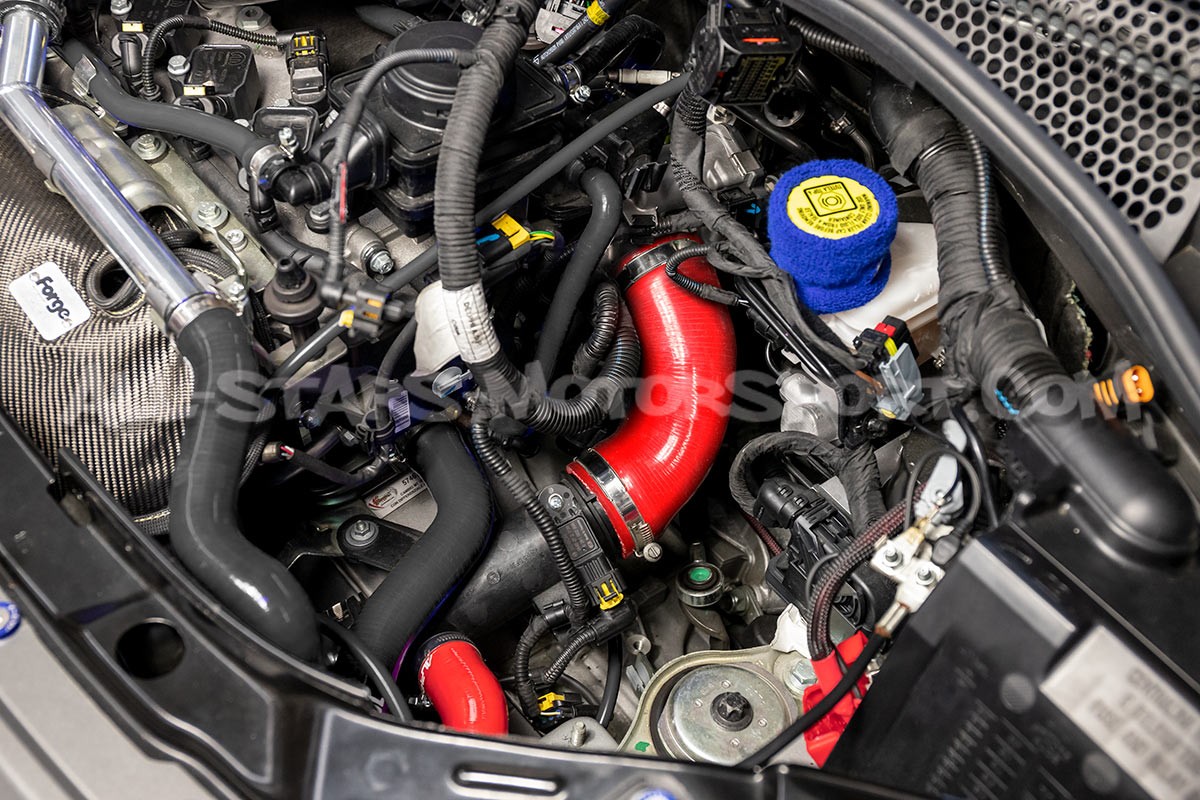 Ce kit de 2 durites de turbo en silicone renforcé Alpha Competition déstiné aux moteurs 1.4 T des 595 / 695 Abarth s'installe sans modifications en remplacement direct des durites d'outlet de turbo et de dump valve de série, afin d'apporter à la fois une touche race / chic à la baie moteur grace à 3 finitions au choix (rouge, bleu ou noir) mais également afin de fiabiliser le circuit de suralimentation avec sa structure multi couche renforcée résistant à des températures et pressions extrêmes.