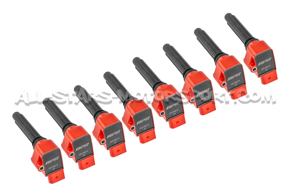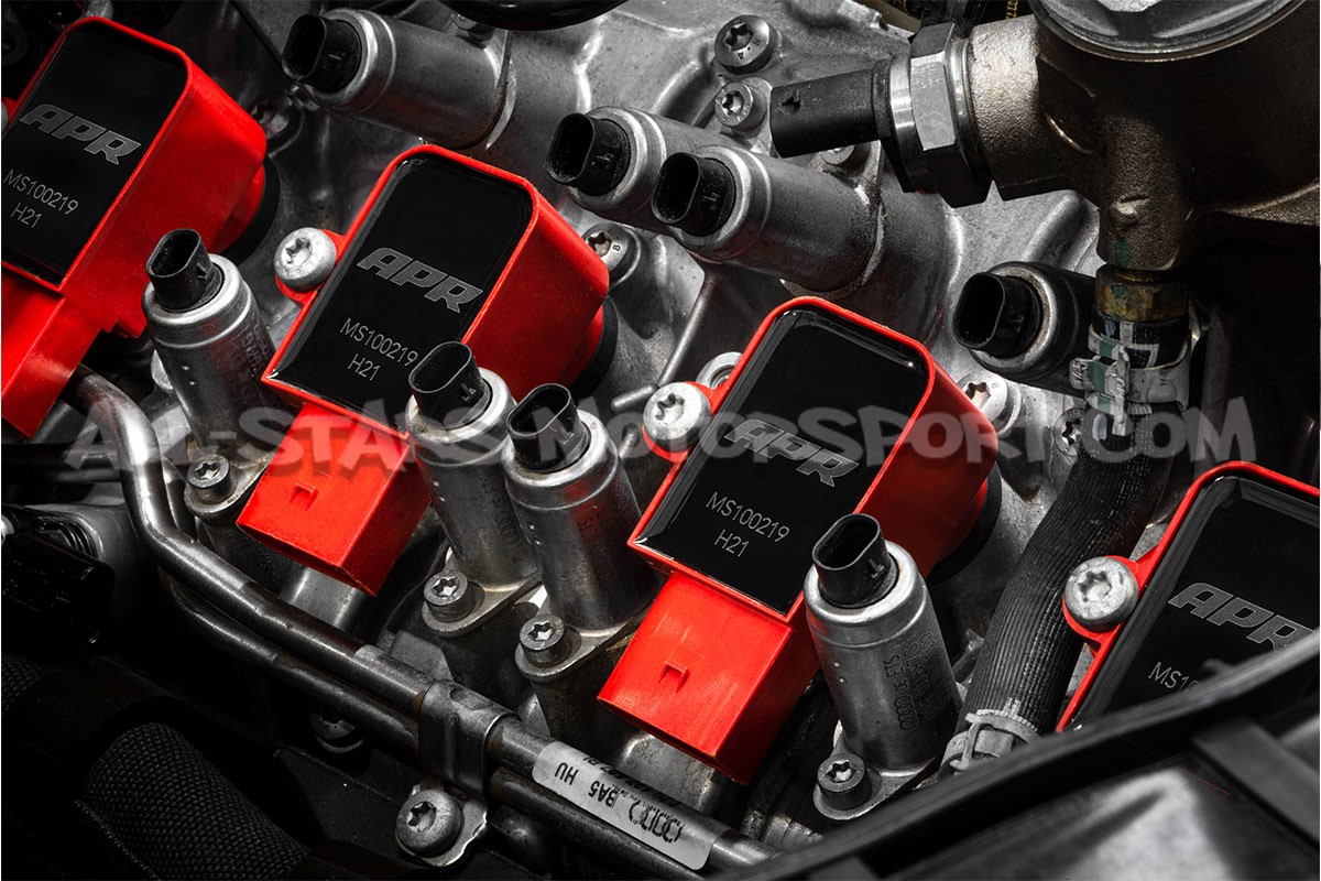Les bobines d’allumage APR haute performance constituent l'une des évolutions les plus simples à mettre en place sur les moteurs 4.0 TFSI EA824 équipant entre autres les Audi RS6 C7 / RS7 C7. Vendues en pack de 8 bobines, s'installant en remplacement direct des bobines de série, elles permettent d'obtenir à la fois un allumage plus stable et puissant mais également un look plus racé !