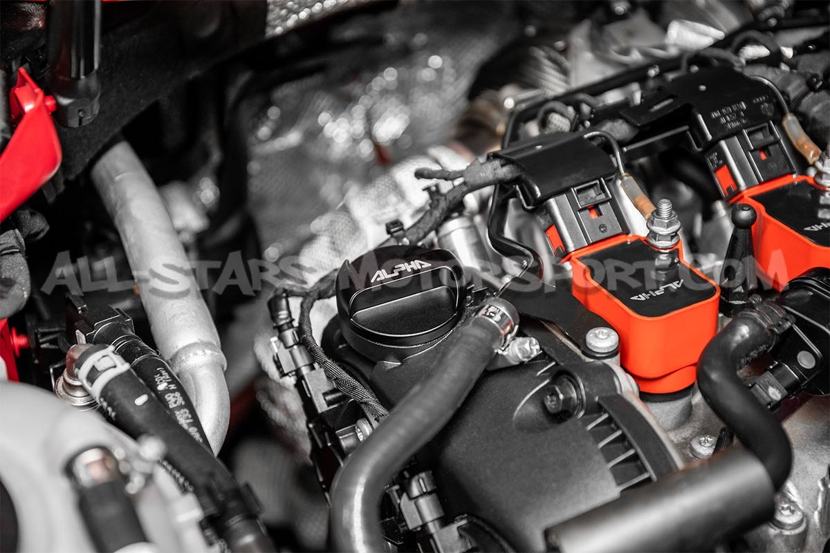 Destiné à remplacer le bouchon en plastique installé d'origine sur les moteurs 1.8 / 2.0 TFSI EA888.3 et EA888.4 des Golf 7 GTI / Golf 8 R / Leon 3 Cupra / Audi S3 8V ou TT 8S, ce bouchon d'huile Alpha Competition fabriqué en aluminium apportera une touche élégante à la baie moteur grace à sa finition noire satinée.