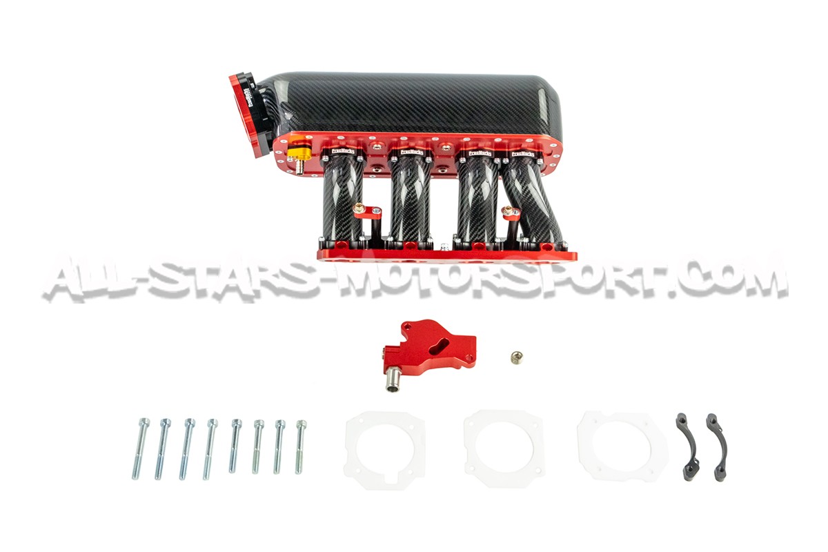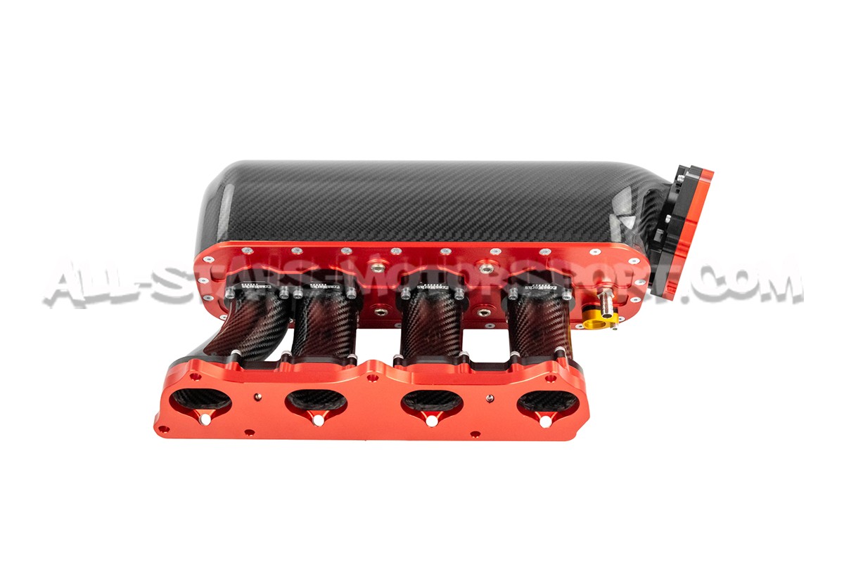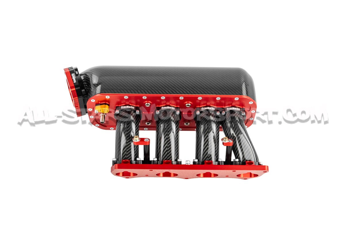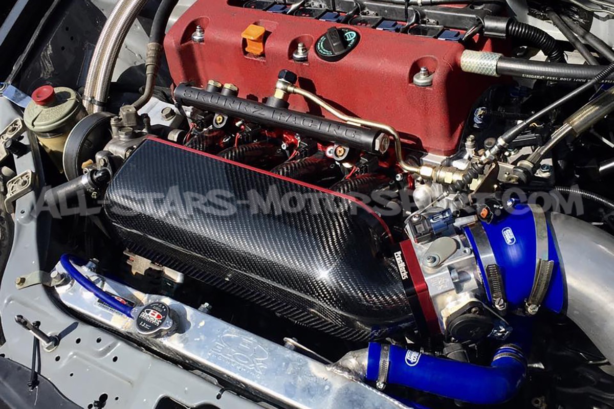 Fabriqué en fibre de carbone finition brillante avec accessoires en aluminium anodisé rouge, ce collecteur d'admission gros volume (6L) PracWorks, s'installe sans modifications sur les moteurs K24 installés dans des chassis de Civic EG et EK et ce afin d'optimiser les flux d'air à mi et haut régime. Disposant d'un angle des conduits spécifique lui permettant de passer sans toucher le capot, ce collecteur d'admission, 40 fois moins conducteur de chaleur que celui de serie, permettra d'abaisser les températures à l'admission tout en augmentant le débit d'air afin d'offir un gain de près de 15cv sur un moteur d'origine et ce dès 3500trs / mn!