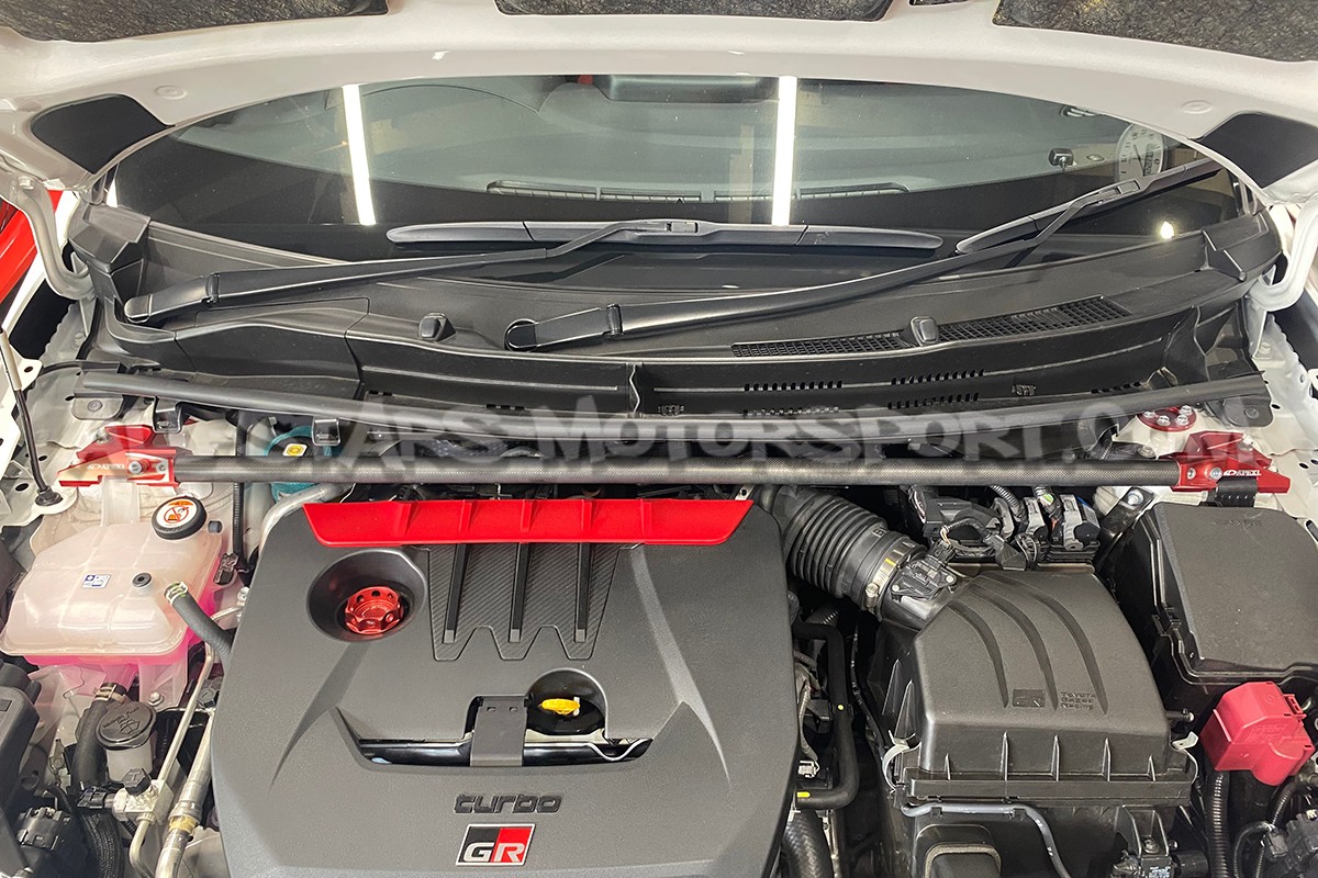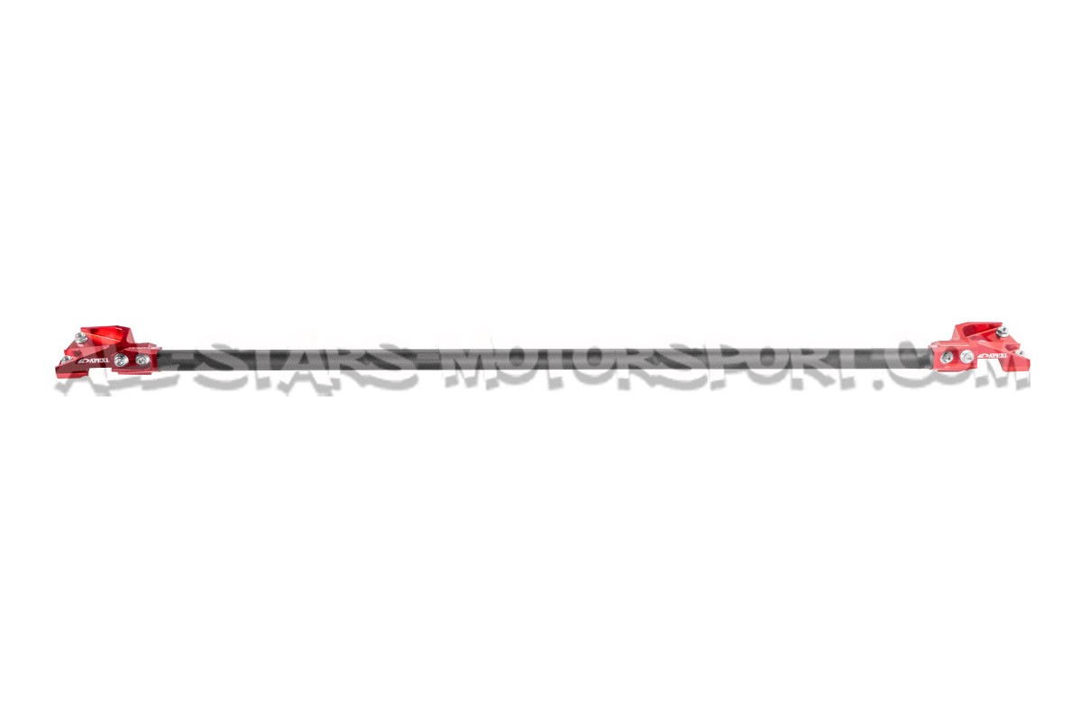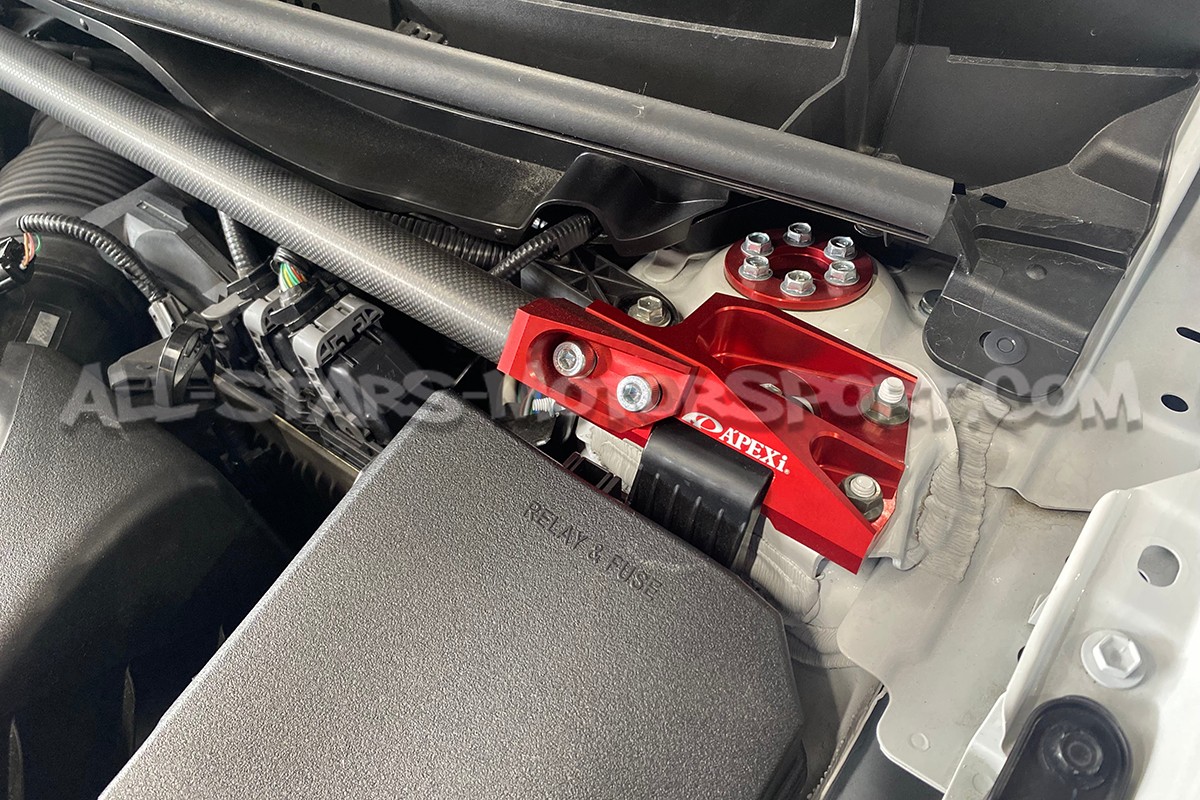 Véritable oeuvre d'art, cette barre anti rapprochement supérieure avant Apexi est fabriquée en fibre de carbone finition mate et en aluminium anodisé rouge. S'installant sans modification sur les moteurs G16E des Toyota Yaris GR Gen.1, cette barre apportera une rigidité additionnelle au chassis mais surtout un aspect unique à la baie moteur.