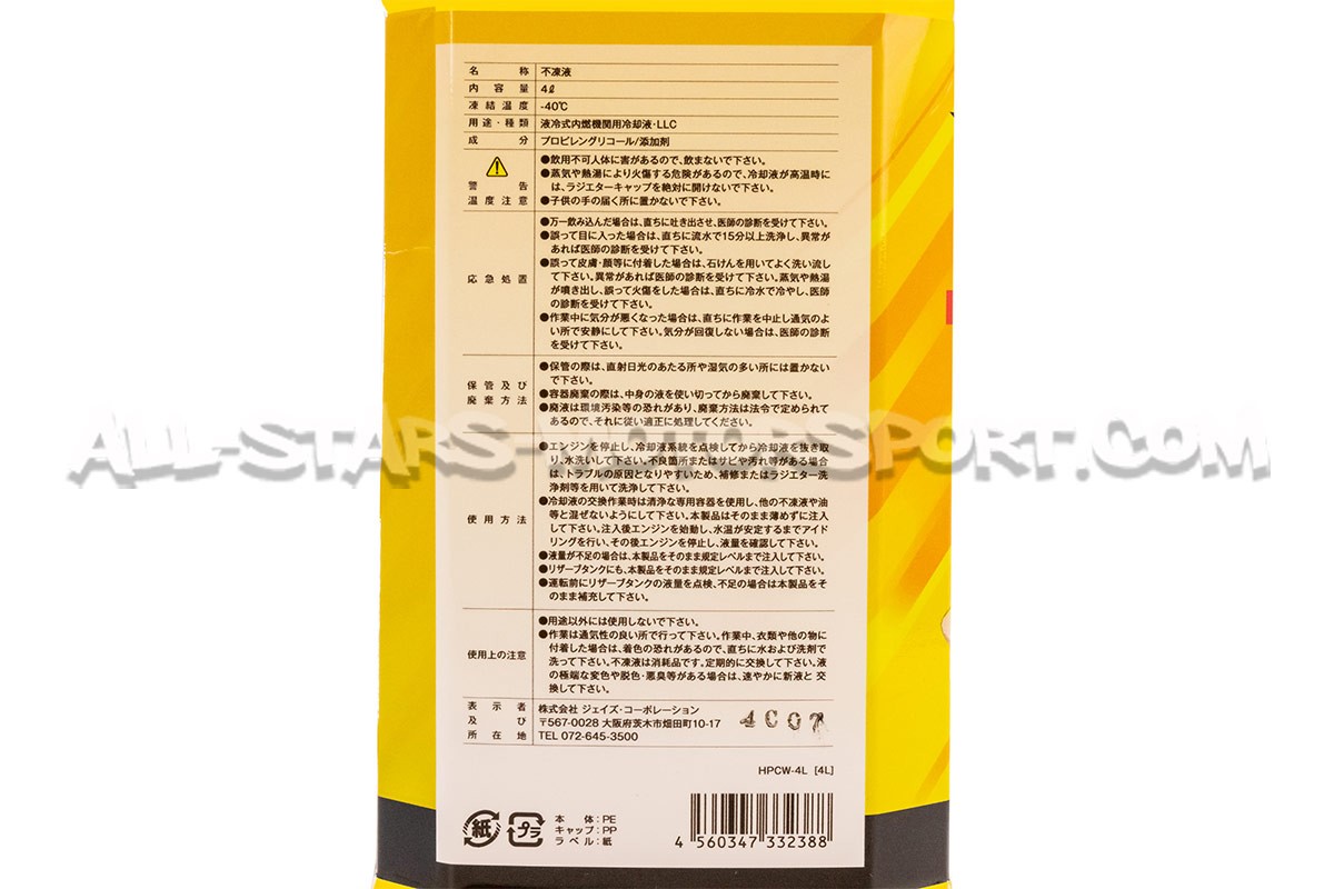 Conçu et fabriqué au Japon, le liquide de refroidissement J's Racing Hyper Cooling est composé à 55% de propylène glycol, d'eau demineralisée et de bropyrene afin d'offrir des proprietés de dissipation thermique incomparables. Parfaitement adapté à un usage intensif, ce liquide de refroidissement optimisera les temperatures de fonctionnement des moteurs les plus puissants, sur route comme sur piste !