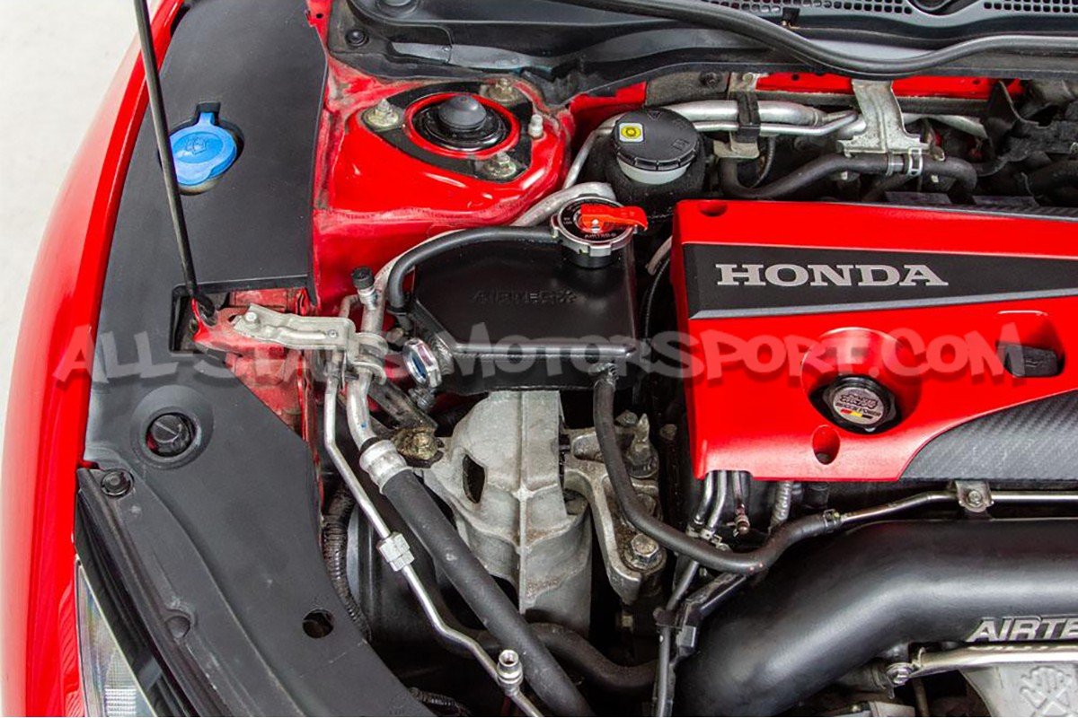 Fabriqué en aluminium à la finition noire satinée, ce vase d'expansion Airtec s'installe sans modification en remplacement de l'élément d'origine en plastique sur les moteurs K20C1 des Honda Civic Type R FK8. Disposant d'un point de control du niveau de liquide de refroidissement placé sur la partie avant et d'un bouchon spécifique, ce bocal apportera une touche elegante à la baie moteur tout en optimisant la fiabilité du circuit d'eau.