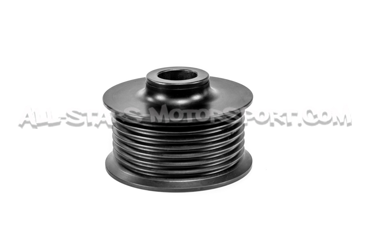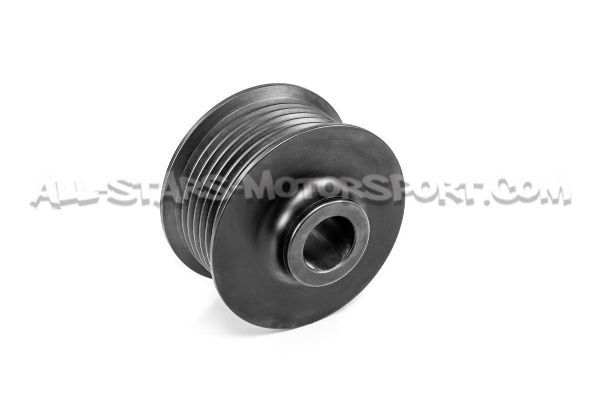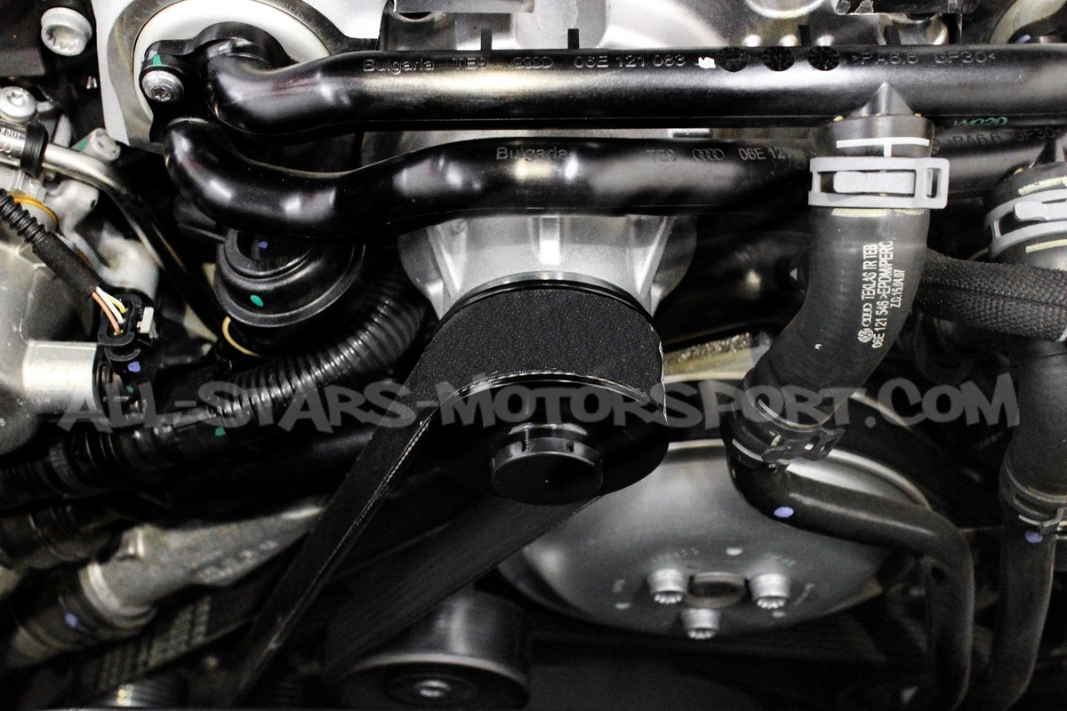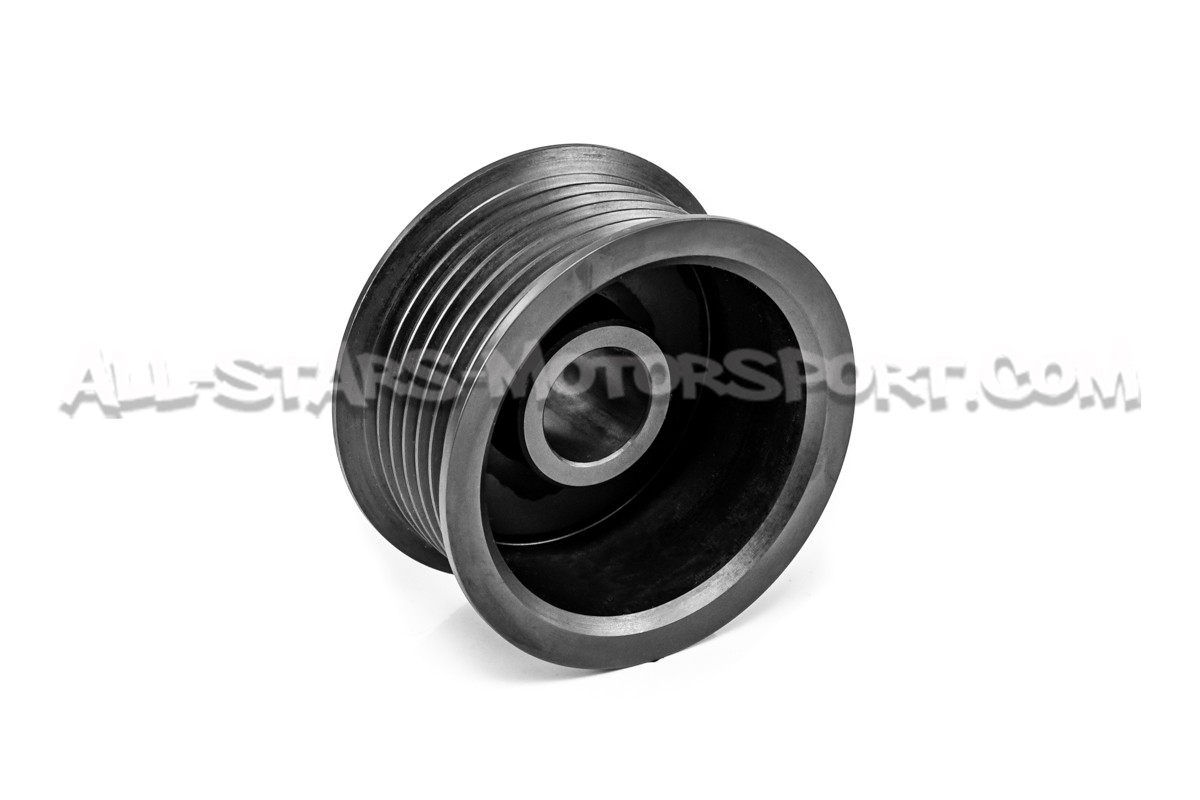 Cette poulie de compresseur de diamètre inférieur à celle d'origine permettra une rotation plus rapide du compresseur de votre 3.0 TFSI, augmentant donc la pression de suralimentation délivrée par ce dernier. Disposant d'un équilibrage parfait et d'une courroie spécifique, cette évolution combinée a une reprogrammation n'engendrera aucune contrainte supplémentaire sur le compresseur